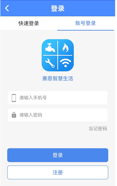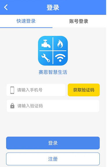 打開智慧生活A(yù)PP,可以以“快速登錄”或“賬號登錄”兩種方式登錄。“快速登錄”需要輸入手機(jī)號、獲取驗(yàn)證碼之后,輸入驗(yàn)證碼直接登錄。“賬號登錄”需要輸入已注冊的手機(jī)號以及密碼進(jìn)行登錄。如圖