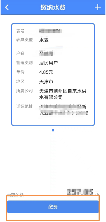 進(jìn)入繳納水費(fèi)界面,如果綁定了多塊水表,左右滑動(dòng)選擇要繳納水費(fèi)的表具后點(diǎn)擊繳費(fèi)按鈕。如圖