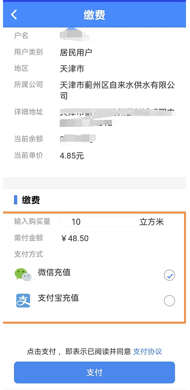 在繳費(fèi)之前請核對表具信息輸入購買噸數(shù),支付方式支持微信和支付寶兩種方式。選擇輸入完畢之后點(diǎn)擊支付。如圖