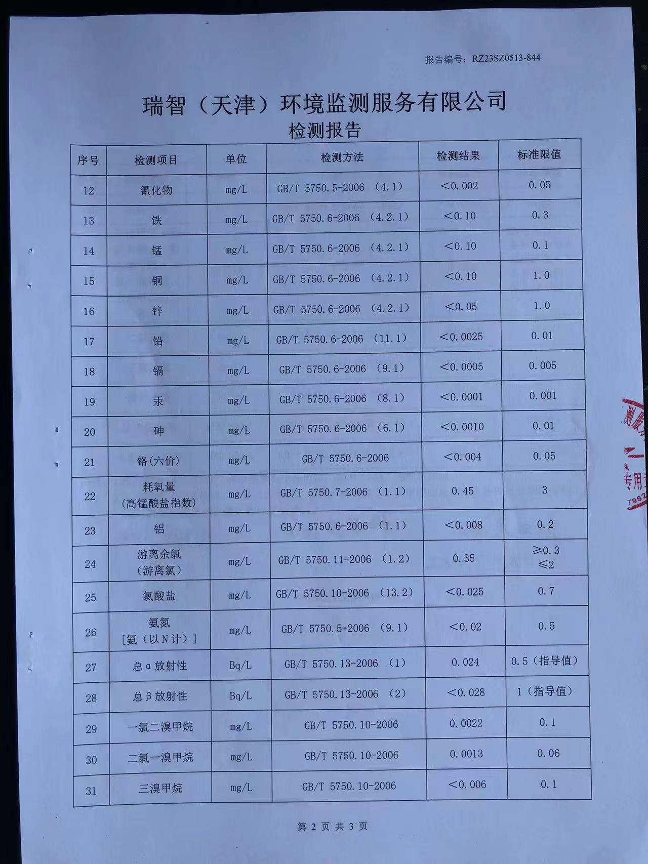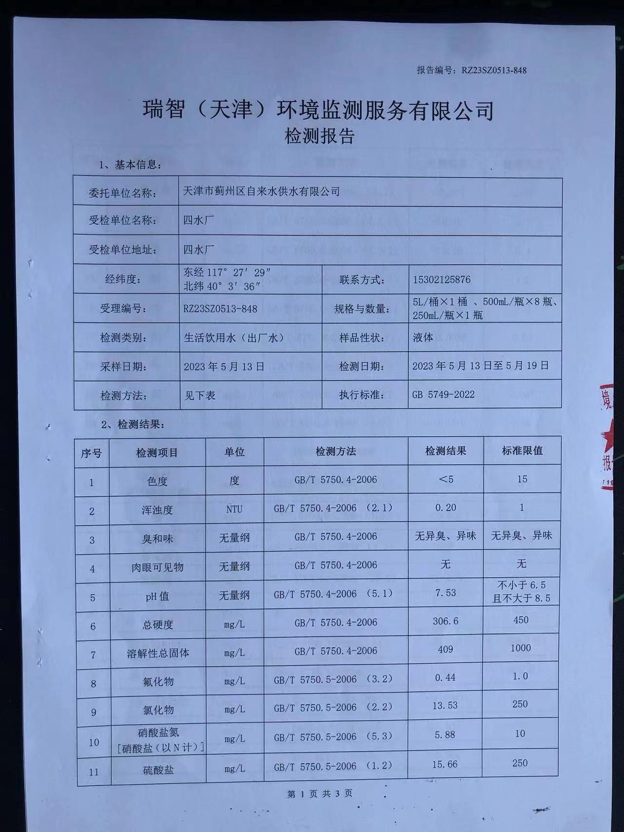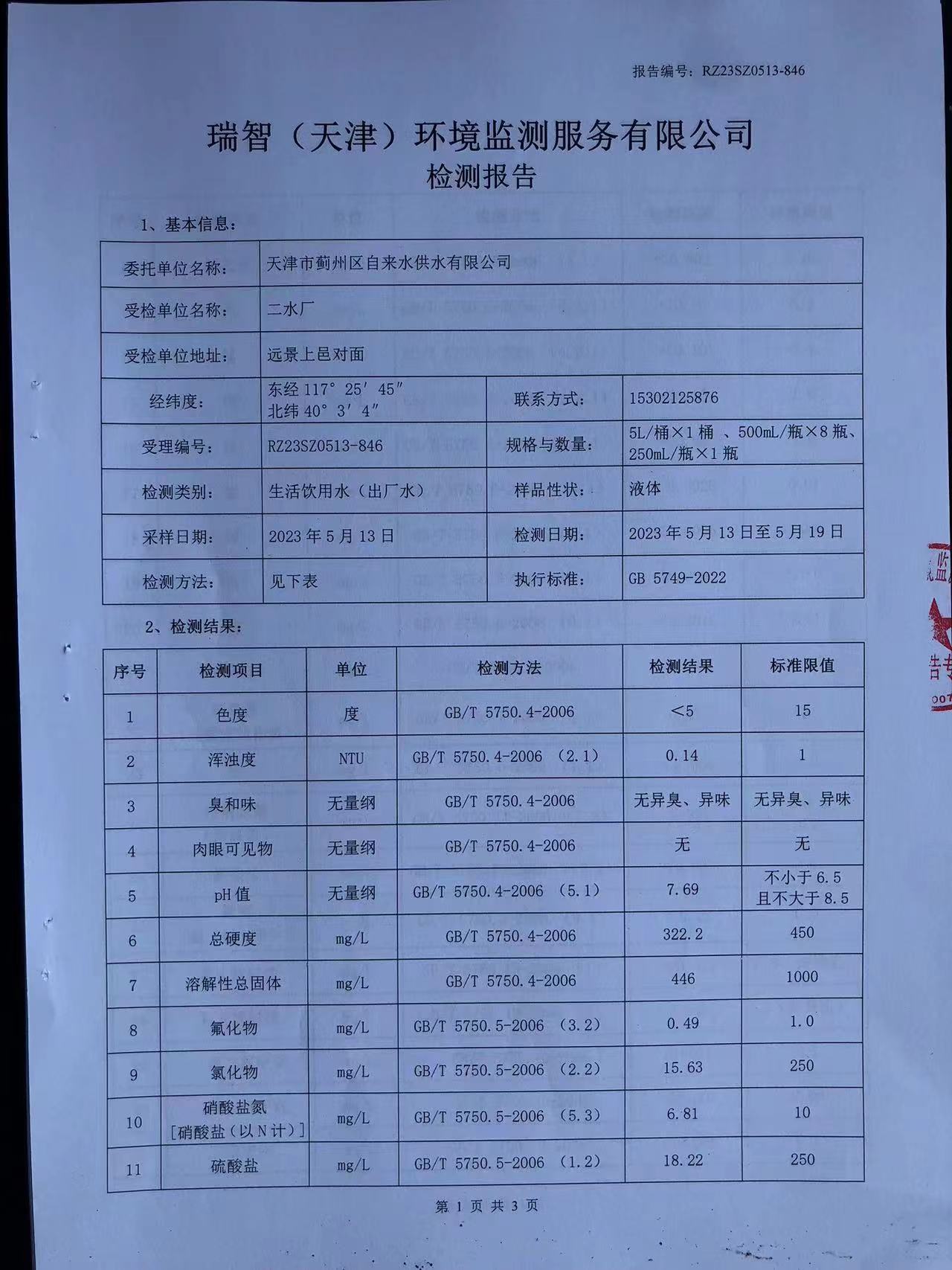 2023年5月份水質(zhì)檢測(cè)報(bào)告