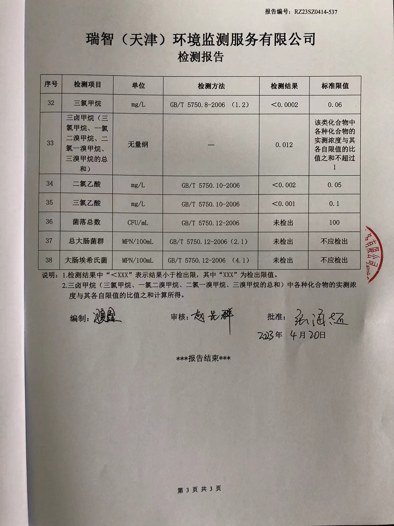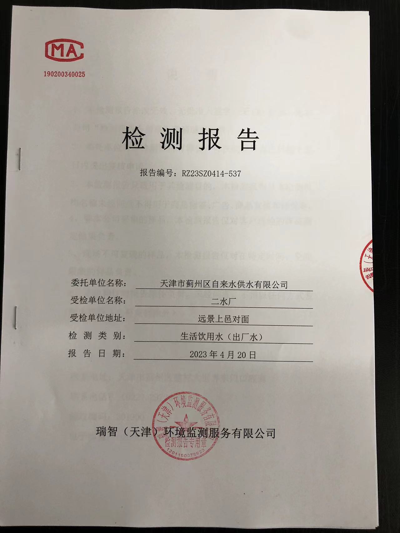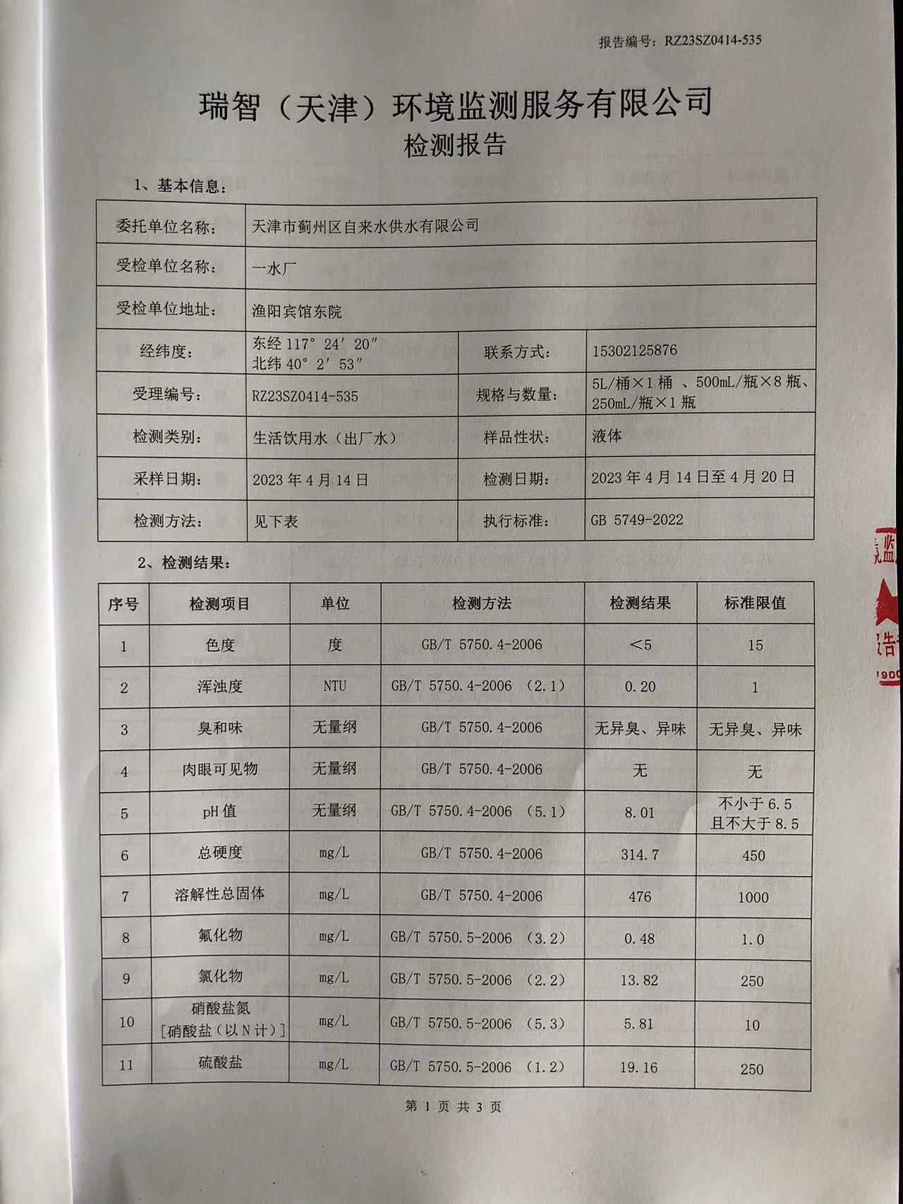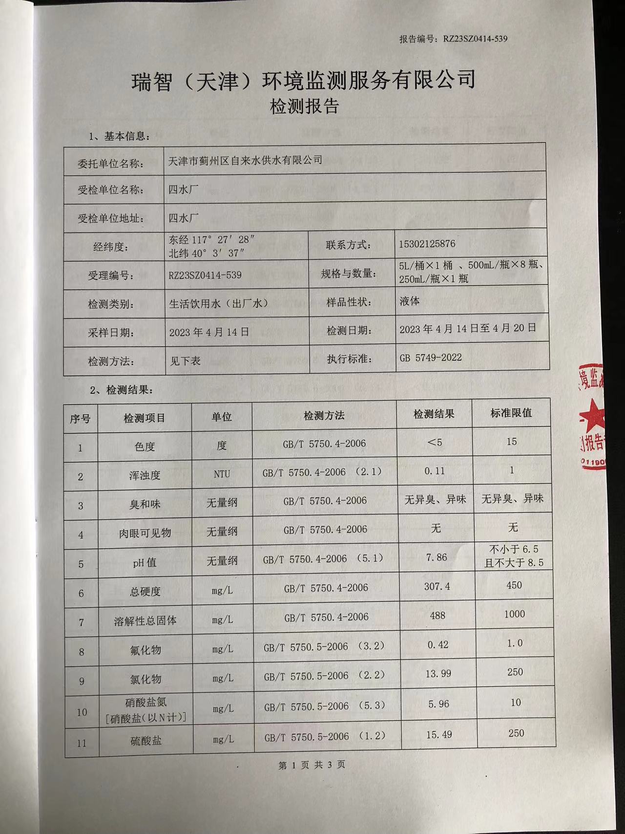 2023年4月份水質(zhì)檢測(cè)報(bào)告