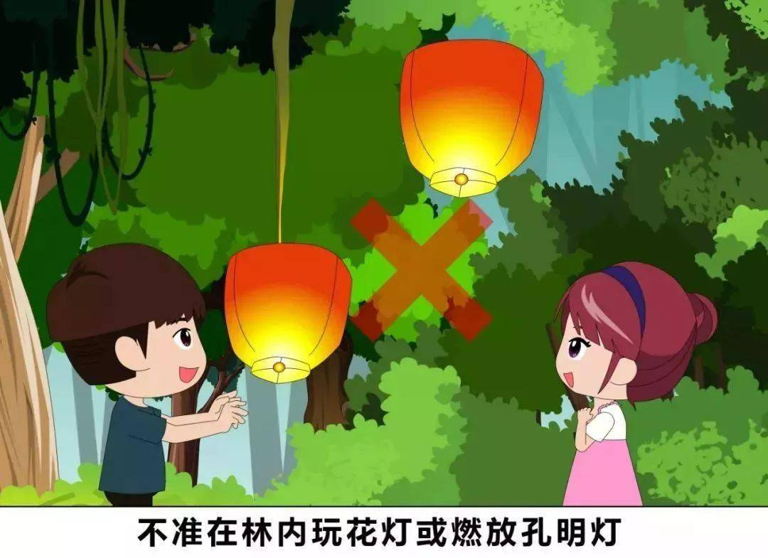 不準在林區(qū)里玩花燈或者燃放孔明燈,孔明燈雖然可以飛得很高很高,但是也很容易被林內(nèi)的樹枝攔下,從而引發(fā)可怕的森林大火!